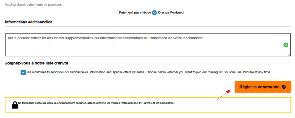 Pour passer votre commande, vous devez renseigner vos informations personnelles et votre adresse de facturation suivant les étapes. Si vous êtes déjà client, cliquez sur Déjà enregistré ? pour vous authentifier. Ensuite vous selectionnez votre mode de paiement puis cliquez sur Régler la commande.